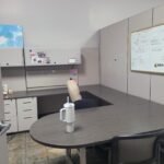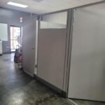 These used cubicles feature 85″ high partitions for privacy, with locking doors and peninsula-style desks. Made by Open Plan Systems and AO2 Clone, they are available for immediate use.